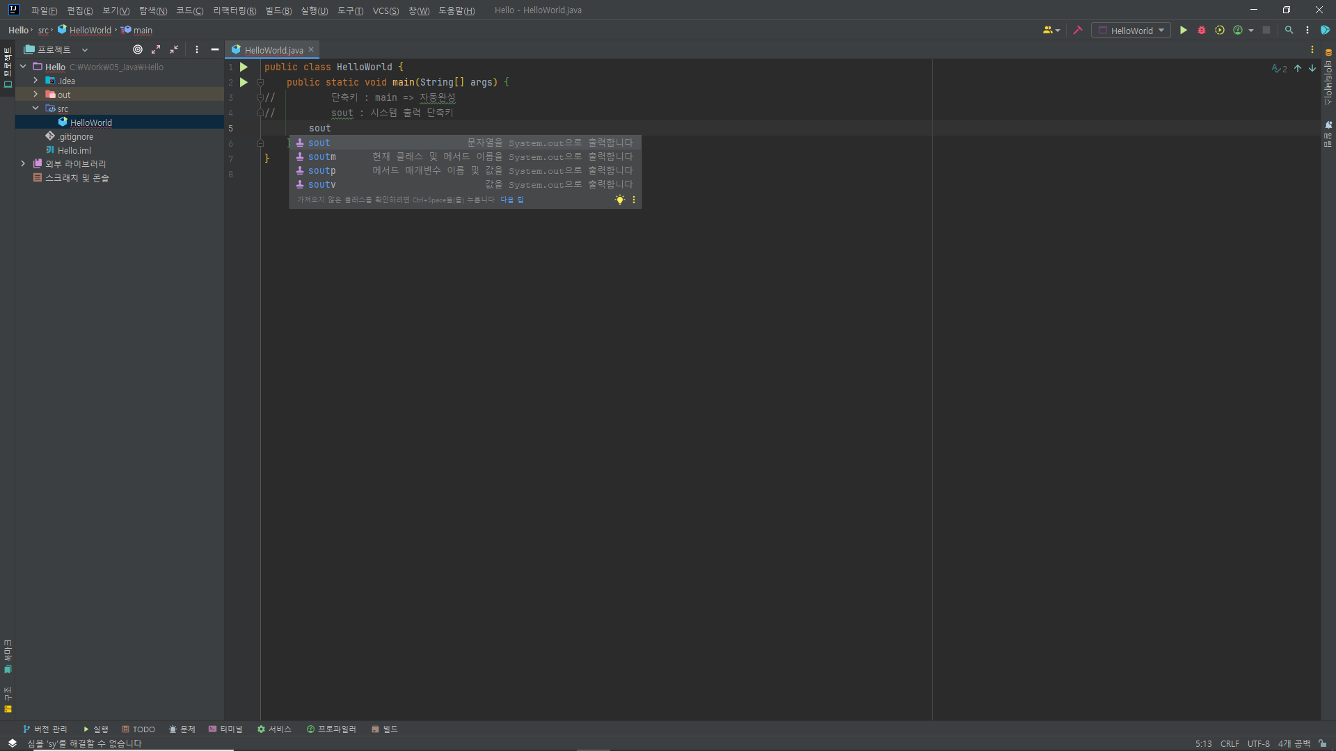 // 출력 단축키 : sout