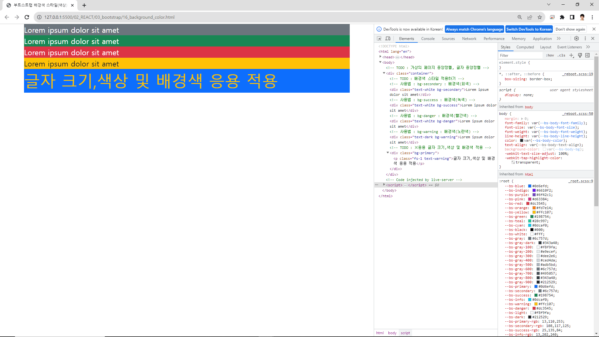 <p class="fs-1 text-warning">글자 크기,색상 및 배경색 응용 적용</p>