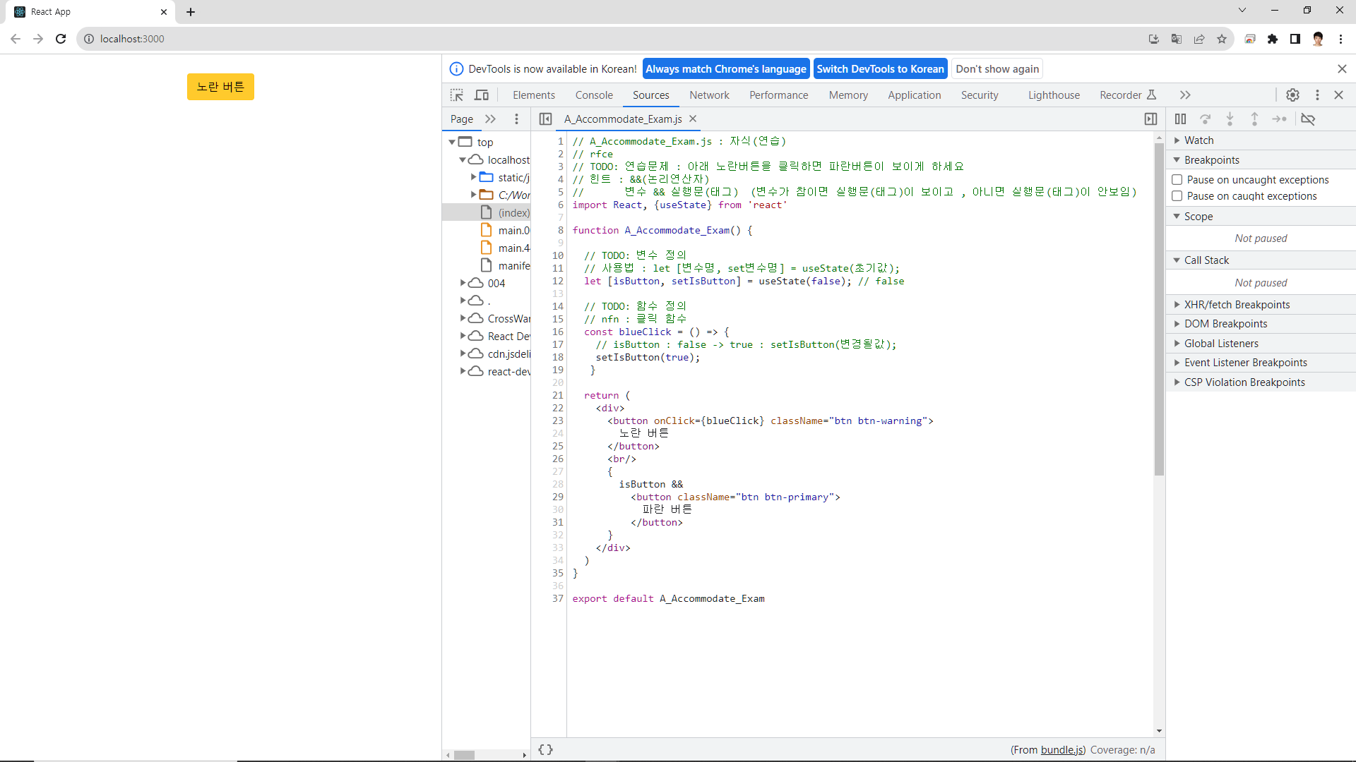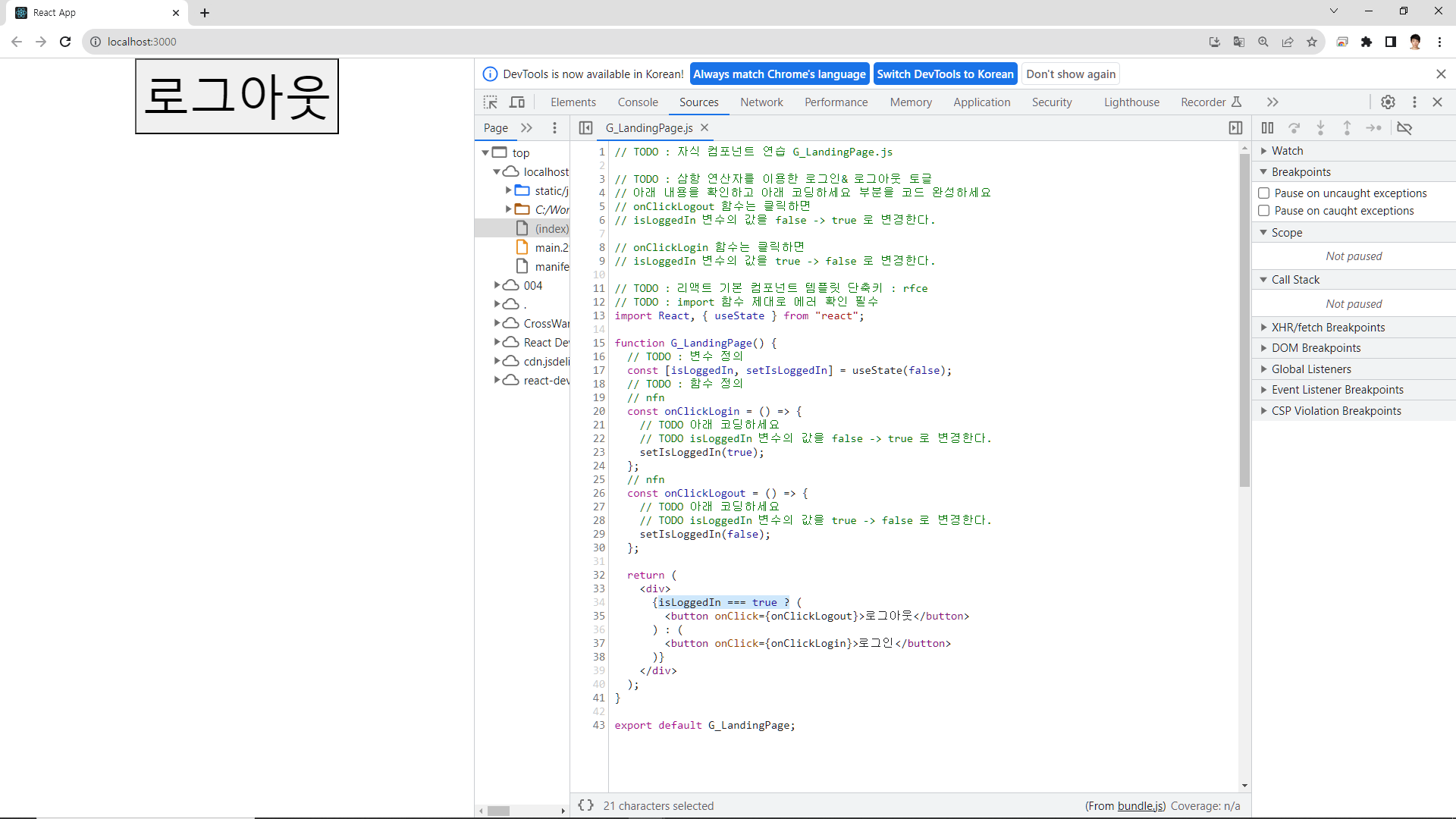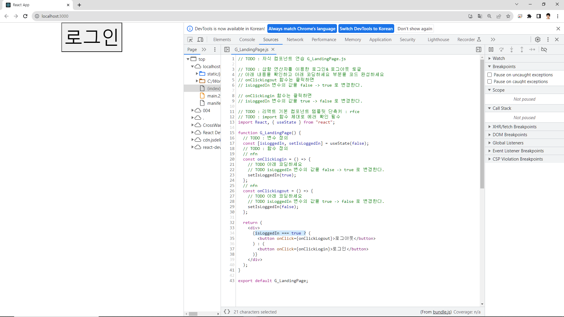 // TODO: 리액트의 조건문 : 1) 논리연산자(&&) 2) 3항 연산자
