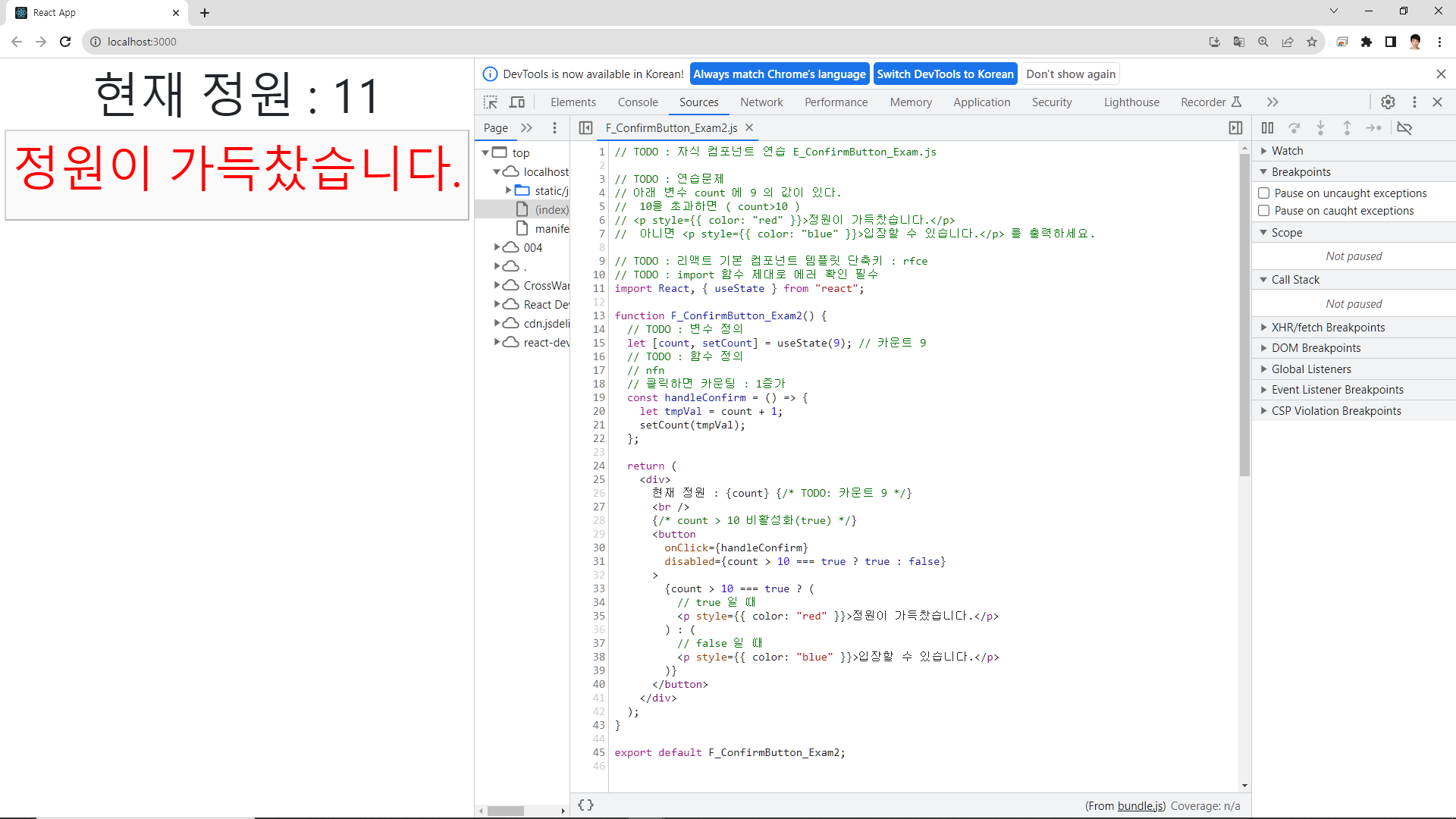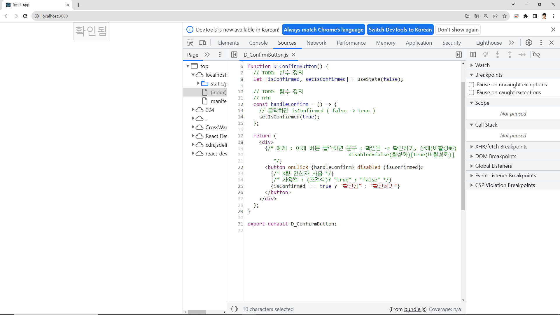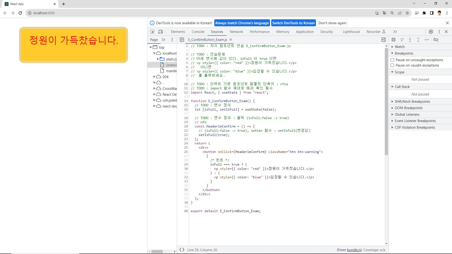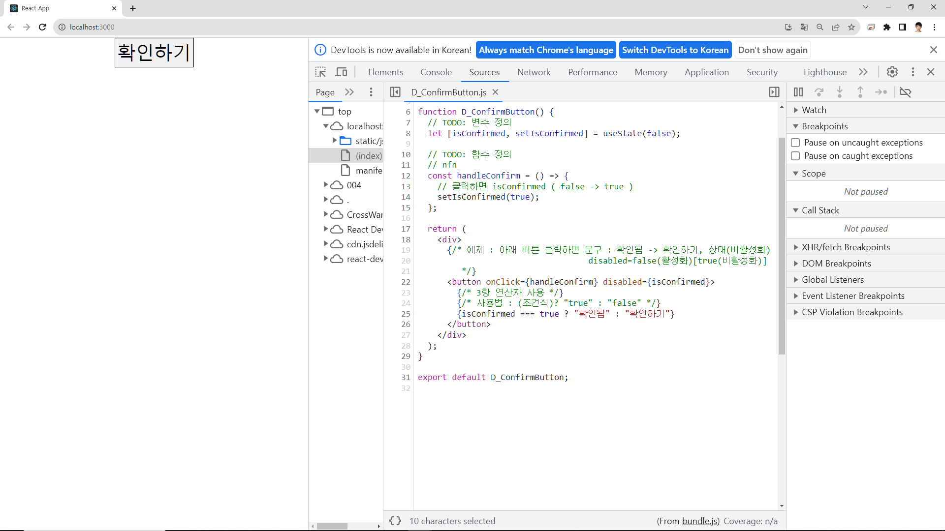 // TODO: 리액트의 조건문 : 1) 논리연산자(&&) 2) 3항 연산자