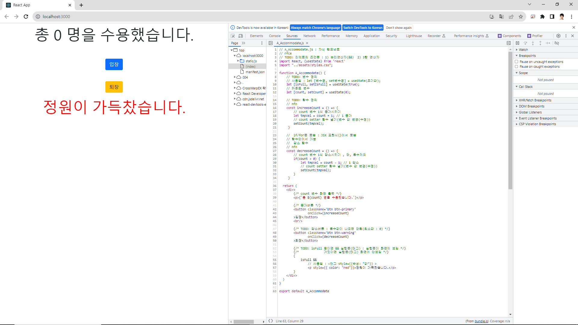 입장 및 감소 버튼 클릭 시 실시간 화면으로 count 변수 1씩 증, 감소 보여주기