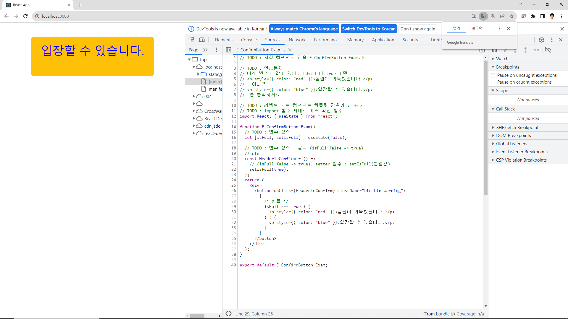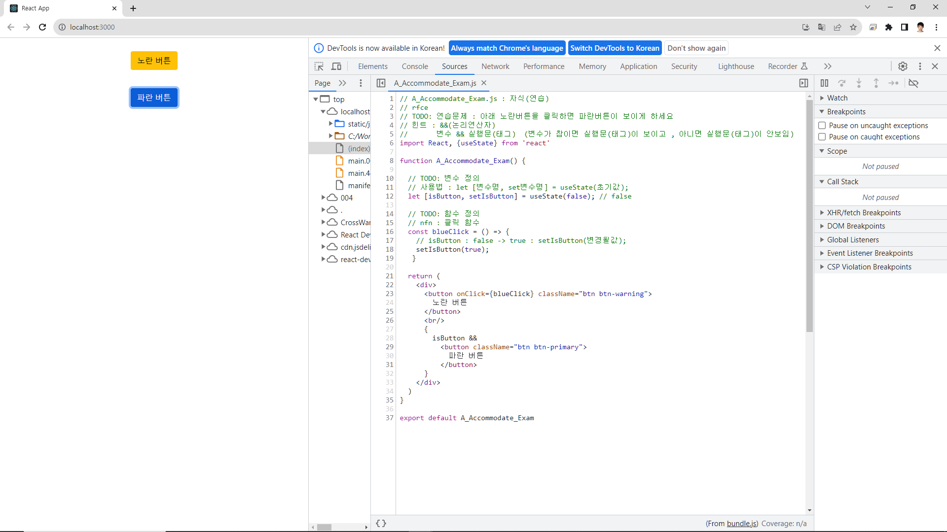 // TODO: 리액트의 조건문 : 1) 논리연산자(&&) 2) 3항 연산자