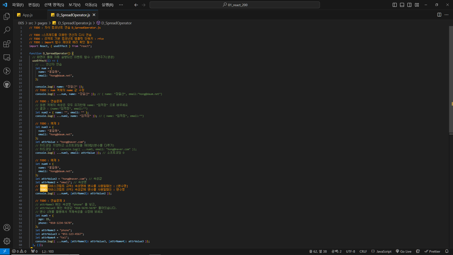 // TODO: (힌트) 스프레드 (x) 객체 (x) : 일반 숫자변수 사용