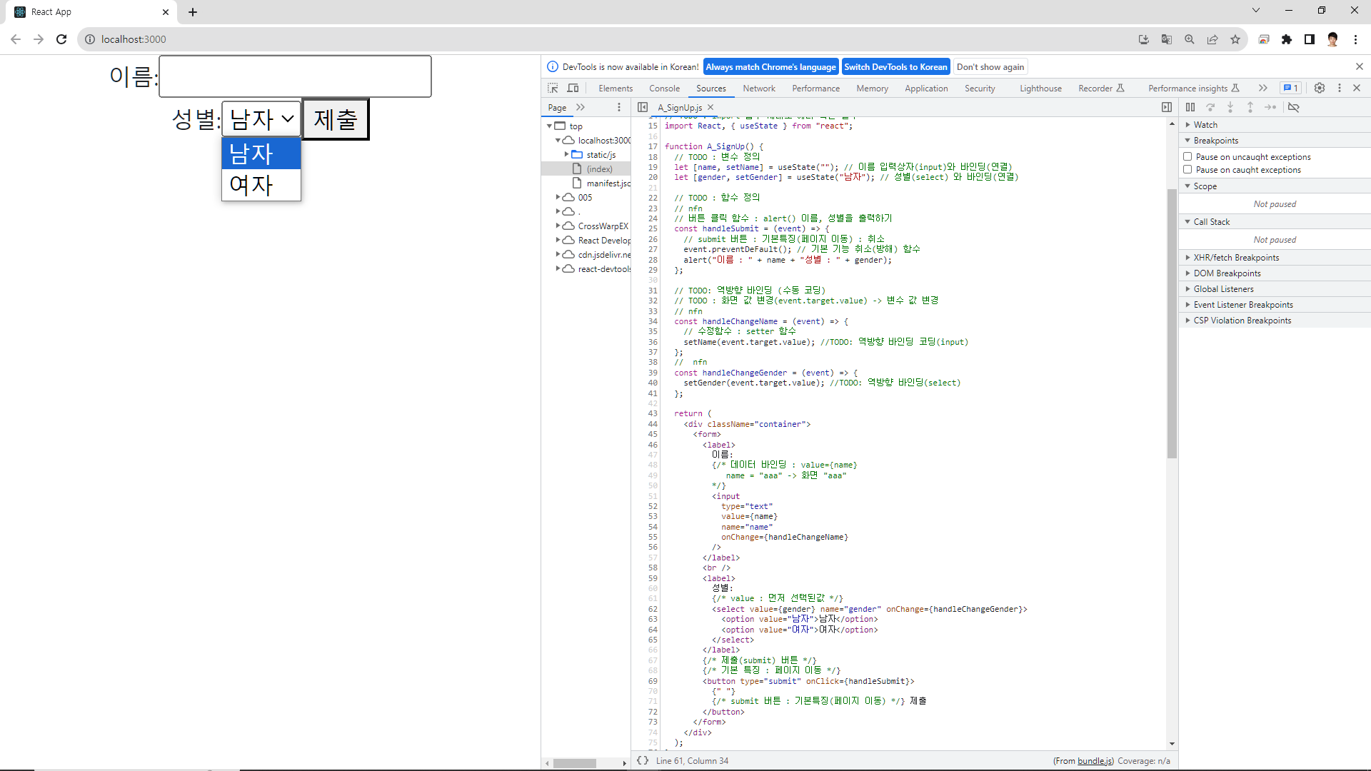 let [gender, setGender] = useState("남자"); // 성별(select) 와 바인딩(연결)