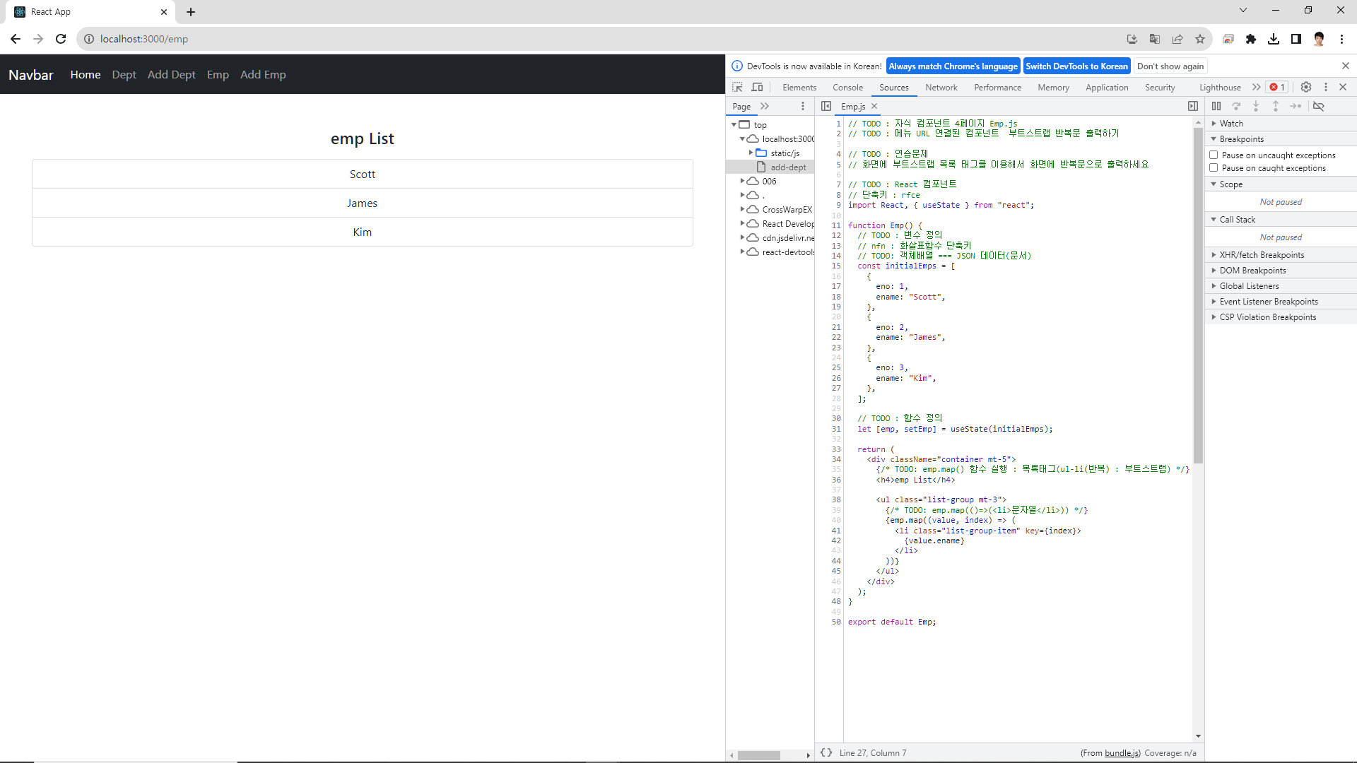 {/* TODO: emp.map() 함수 실행 : 목록태그(ul-li(반복) : 부트스트랩) */}